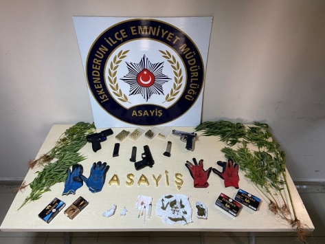 Adreslerde yapılan aramada, 8 gram eroin, 14 gram kubar esrar, 8 kök Hint keneviri, 4 gram metamfetamin, 203 tabanca fişeği, 3 ruhsatsız tabanca ve bu tabancalara ait şarjör ele geçirildi.