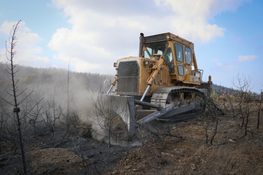 İş makineleriyle yanan bölgelerdeki kalıntıları temizleyen ekipler, toprağı da hazır hale getiriyor.