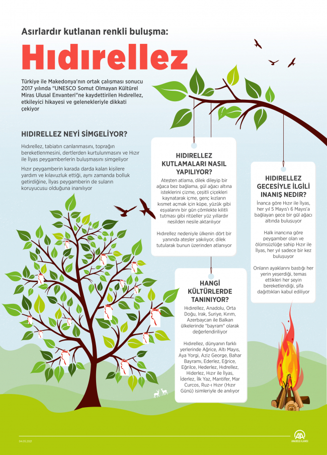 Hıdrellez geleneğinin Türk dünyası ve Anadolu coğrafyası ile sınırlı olmadığını, Irak, Suriye ve Balkan ülkelerinde de kutlandığını anlatan İnayet, "İnanca göre Hızır ile İlyas, her yıl 5 Mayıs'ı 6 Mayıs'a bağlayan gece bir gül ağacı altında buluşmaktadır. Dolayısıyla bu iki kutsalın buluştuğu günün, temas ettikleri her şeyin de insanlara bereket, kısmet ve sıhhat getirdiğine inanılmaktadır. Dilek dileyenlerin gül dalına, ağaçlara bez bağlaması, hastaların çimenler üzerinde yuvarlanması, o gecenin suyuyla yıkanıp arınmaları bu inanıştan kaynaklanır" dedi.