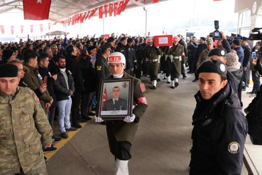 İdlib şehitlerinden Özler'in Türk bayrağına sarılı tabutu, cenaze töreni için Gaziantep merkezdeki Bahaeddin Nakıboğlu Camisi'ne götürüldü.