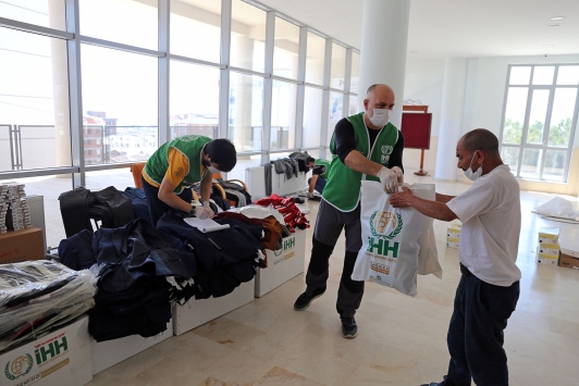 İHH, İstanbul Pendik İTO Şehit Ahmet Aslanhan Anadolu İmam Hatip Lisesi'nde geçici konaklayan 35 evsize kıyafet ve hijyen paketi dağıttı.