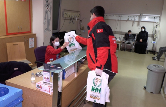 Bu kapsamda İHH ekipleri, gece gündüz vatandaşları için çalışan sağlık personellerine teşekkür etmek için hazırladığı küçük hediye paketlerini hastane hastane dolaşarak kendilerine teslim etti.