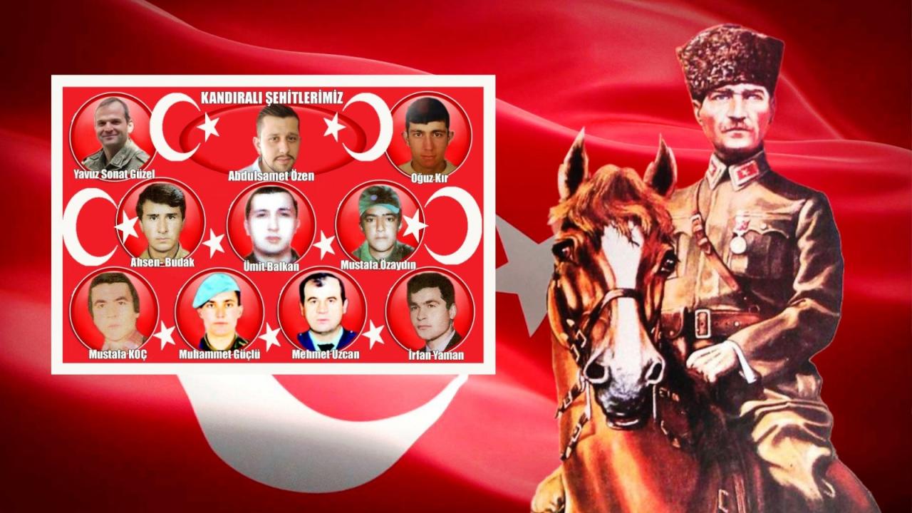 Çanakkale Zaferi'nin 106. yıl dönümü ve Şehitleri Anma Günü etkinlikleri kapsamında hazırlanan afişte Başkomutan Mustafa Kemal Atatürk ve Kandıralı şehitler Yavuz Sonat Güzel, Abdulsamet Özen, Oğuz Kır, Ahsen Budak, Ümit Balkan, Mustafa Özaydın, Mustafa Koç, Muhammet Güçlü, Mehmet Uzcan ve İrfan Yaman’ın fotoğrafları ve isimleri yer aldı.
