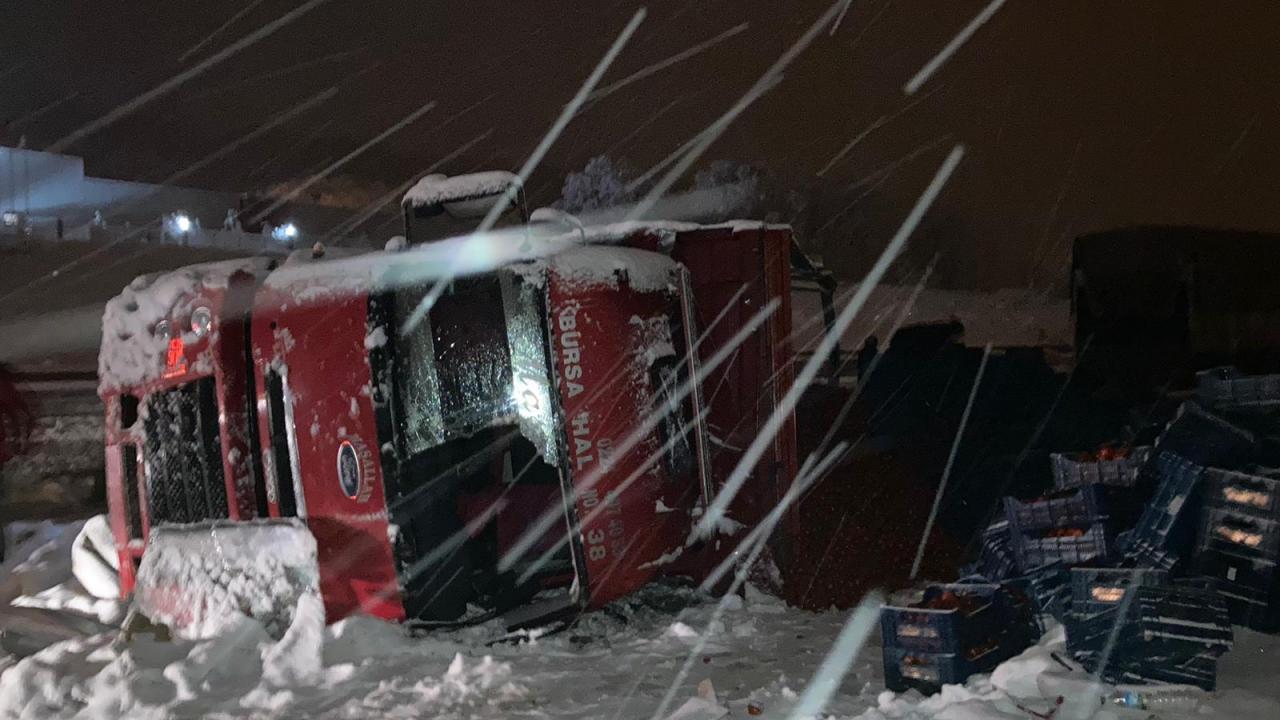 Selahattin Z. yönetimindekiı domates yüklü tır, Bursa-Ankara kara yolunun Mezitler Boğazı mevkisinde kar nedeniyle kayganlaşan yolda kayarak yana devrildi. Tırın kasasında bulunan domatesler ise yola saçıldı.