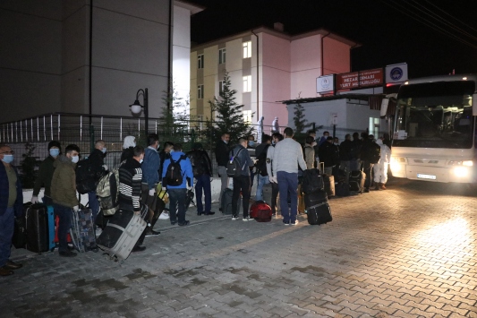 Uçaktan inen işçiler sağlık kontrolünün ardından, polis ve AFAD ekipleri eşliğinde otobüslerle kent merkezine taşındı.