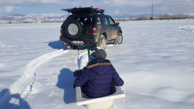 Kızağa dönüştürülen küvete binen çocuklar, babalarının kullandığı aracın çektiği küvette eğlenceli zaman geçirdi.