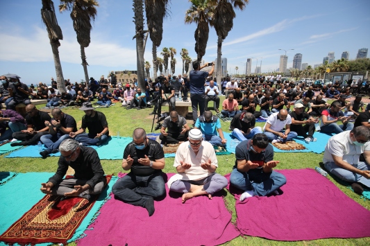 Yafa’daki protesto gösterisi öncesi mezarlığın çevresindeki açık alanda cuma namazı için saf tutuldu. Namazı, Mescid-i Aksa İmam Hatibi Şeyh İkrime Sabri kıldırdı.