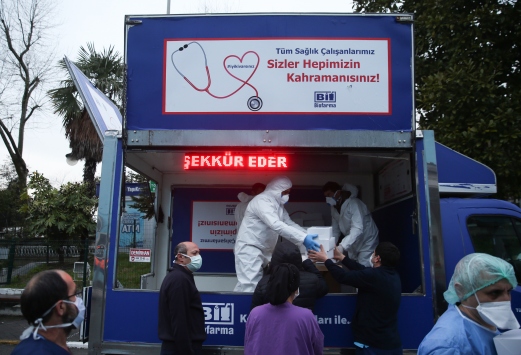 Özel gıda araçlarındaki özel kıyafetli görevliler sosyal mesafe kuralları içinde hastanelerde görev yapan doktor, hemşire, hasta bakıcı, idari personel ve temizlik personeline kahvaltılıktan oluşan gıda kutularını ulaştırdı.