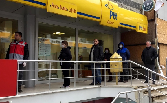 Kentteki PTT önlerinde polis ve zabıta ekiplerinin bariyerleriyle vatandaşlar için sıra düzenlemesi yapıldı.