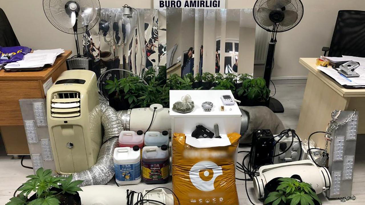 Şüphelinin adreslerinde yapılan aramalarda, 33 kök adet Hint keneviri, 1 adet ruhsatsız tabanca, 41,15 gram kannabinoid ve uyuşturucu madde üretiminde kullanılan çok sayıda materyal ele geçirildi.
