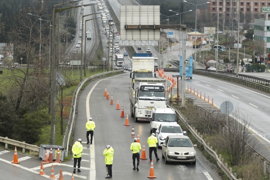 İstanbul'da yeni tip koronavirüs (Kovid-19) tedbirleri kapsamında polis ekipleri şehrin giriş ve çıkışlarında denetimlerini sürdürüyor.