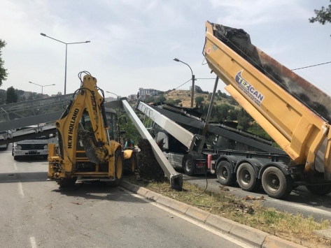 NATO kavşağında devam eden asfaltlama işinde kullanılan, Mehmet Şerif Çağlar idaresindeki özel bir şirkete ait 06 TZ 219 plakalı tırın açık kalan damperi, iki şeritli yolun üzerinden geçen sinyalizasyon levhasına takıldı.