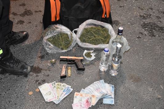 Polis ekipleri, şüphe üzerine durdurulan S.K. (43) yönetimindeki 35 FU 652 plakalı ticari araçta yaklaşık 1 kilogram uyuşturucu, ruhsatsız tabanca, 10 fişek ve bir miktar para ele geçirdi.