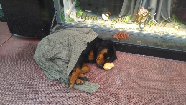 Yalova'da soğuk havanın etkili olduğu kent merkezinde vatandaşlar, İstanbul Caddesi'ndeki bir dükkanın önünde yatan köpeğin üşüdüğünü fark etti.