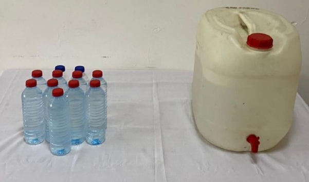 Kapullu Mahallesi'nde R.K'nin evine düzenlenen operasyonda, 0,5 litrelik 12 plastik su şişesi içinde sahte içki ile 20 litrelik bidonda etil alkol ele geçirildi.