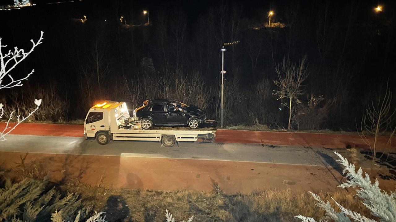 Yol kenarındaki bariyerleri aşan otomobil, yaklaşık 10 metreden bisiklet yoluna düştü.