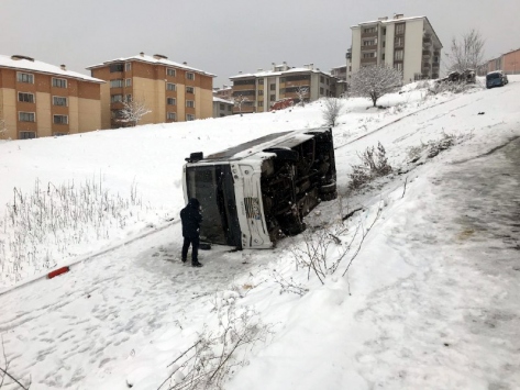 Alınan bilgiye göre, L.A. idaresindeki 78 S 0180 plakalı işçi servisi, işçiler evlerine bırakıldıktan sonra 100. Yıl Mahallesi 1008 No'lu caddede buzlanan yolda sürücünün direksiyon hakimiyetini kaybetmesi sonucu yol kenarına devrildi.