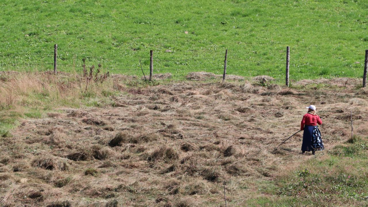 Yayla sakinlerinden 73 yaşındaki Gülizar Atasoy, iki gün önce kurutmaya bıraktığı çayırları kızı ve komşusunun yardımıyla toplamaya devam ediyor.