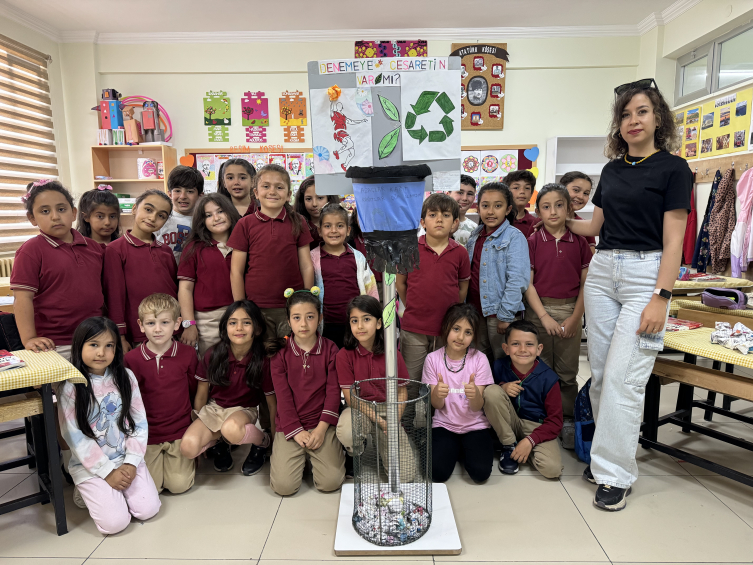 Sosyal Bilgiler Öğretmeni Tuncer Baran ve öğrencileri tarafından gerçekleştirilen proje kapsamında okuldaki atık malzemeler geri dönüşüm kutularında biriktirildi.