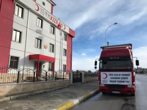 Türk Kızılay Derneği Karaman Şubesi öncülüğünde temin edilen yardım malzemelerini taşıyan tırın uğurlanması dolayısıyla şube binası önünde tören düzenlendi.