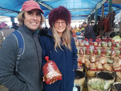 İlçenin organik pazarını da ziyaret eden Brown çifti, "ölümsüzlük meyvesi" olarak da bilinen hünnap ve organik kuru üzümün tadına baktı.
