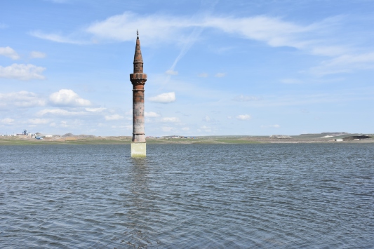 Çamçavuş köyünden geriye kalan ve bir bölümü suya gömülen cami minaresi görenlerin ilgisini çekiyor.
