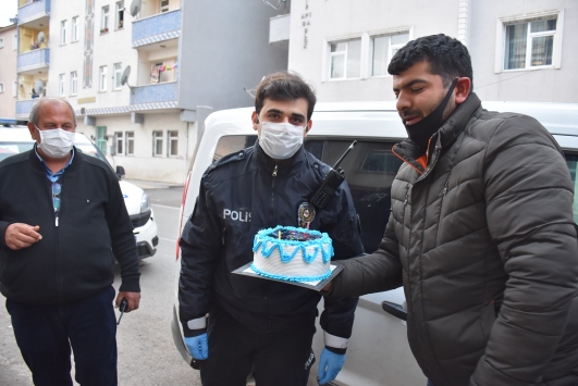Türk Polis Teşkilatının 175'inci kuruluş yıl dönümü ve Polis Haftası dolayısıyla kendileri için hazırlanan sürprizden habersiz şekilde asılsız ihbar için söz konusu mahalleye giden polis ekipleri, pastayla karşılandı.