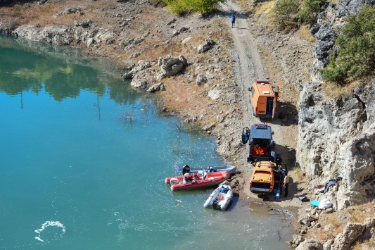 Baraj gölü yakınındaki Sarı Saltuk Viyadüğü'nde sürdürülen çalışmalar kapsamında ekipler, botlarla baraj gölünde, kıyılarında ve baraja su sağlayan dere yataklarında su altı arama robotuyla arama gerçekleştirdi.
