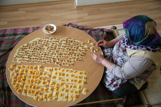 Yapım aşamalarının zorluğu nedeniyle imece usülü hazırlanan mantı, bu yıl koronavirüs (Kovid-19) salgını dolayısıyla tedbiren evlerinde kalmayı tercih eden kadınlarca tek başına yapılıyor.