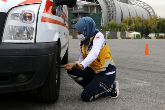 Eğitim sırasında personel, ambulanslarla parkurda test sürüşü gerçekleştirdi. Personel, hastayı en zor koşullarda hızlı ve güvenli şekilde sağlık kuruluşuna ulaştırmak amacıyla ani manevra yaparak parkuru tamamlamaya çalıştı.