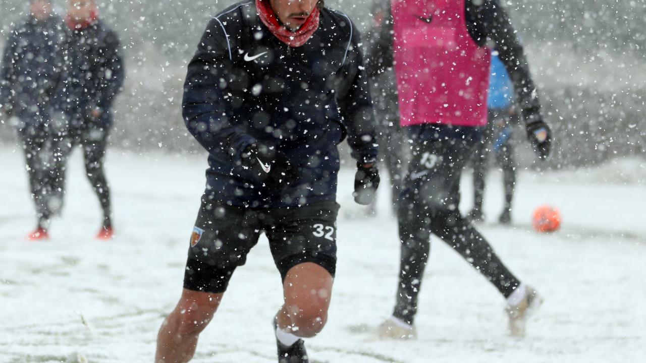 Isınma ve açma germe hareketleriyle başlayan idman, yoğun kar yağışı altında tamamlandı.
