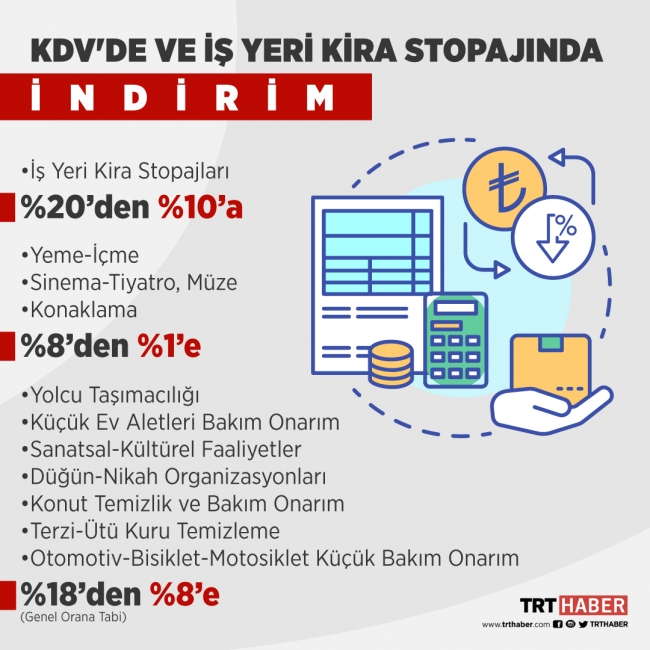 Diğer taraftan, yine salgın döneminde en çok etkilenen sektörlerden turizm ile doğrudan ve dolaylı ilgili olan konaklama hizmeti, yeme-içme sektöründe verilen hizmetler ile sinema, tiyatro, opera, operet, bale ve müze giriş ücreti gibi kültürel faaliyetlerin yüzde 8 olan KDV oranları da yıl sonuna kadar geçici olarak yüzde 1'e indirildi.