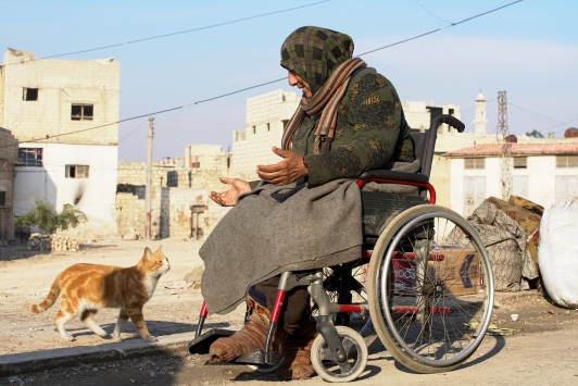 Suriye'nin İdlib ilinde Beşşar Esed rejimi ve destekçilerinin saldırılarında yaralanarak tekerlekli sandalyeye mahkum olan 60 yaşındaki İbtisam Said, yoğun bombardıman nedeniyle ilçeden ayrılmak zorunda kalırken, baktığı kedilerden sadece birini yanında götürebildi.