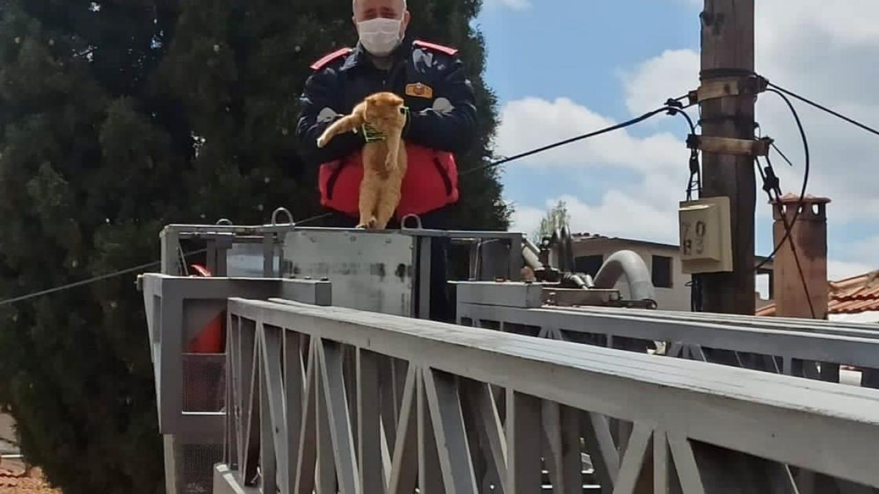 Kedinin sesini duyan vatandaşlar, durumu Keşan Belediyesi İtfaiye Müdürlüğüne haber verdi. Belirtilen adrese gelen ekipler, çıktığı telefon direğinde mahsur kalan kediyi aşağı indirdi.