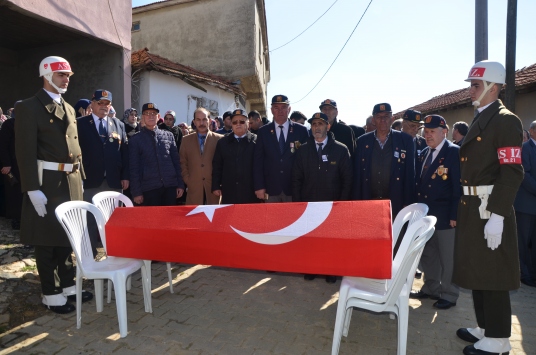 Hulusi Arslan'ın (66) Türk bayrağına sarılı naaşı Hereke Mahallesi'ndeki evinin önüne getirildi.