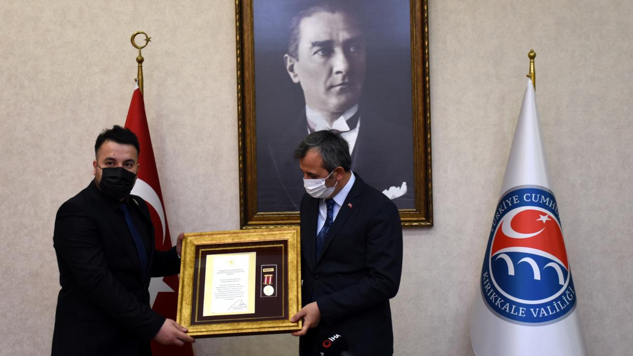 Sezer, konuşmasının ardından Çanakkale'deki törenlerde görevli olduğu için 18 Mart'ta düzenlenen programa katılamayan gazi Jandarma Uzman Çavuş Ümit Kaplan'a devlet övünç madalyası ve beratı takdim etti.