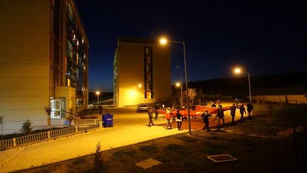 Görevliler daha sonra "Ölürüm Türkiyem" şarkısı eşliğinde açtıkları büyük Türk bayrağı ile yurdun bahçesinde yürüdü. Bu sırada yurttaki vatandaşlar, "Türkiye büyüktür, büyük kalacak" sloganı attı.