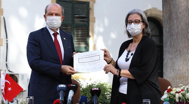 Başkent Lefkoşa'daki Yüksek Seçim Kurulu (YSK) yerleşkesinde yapılan törende, YSK Başkanı Narin Ferdi Şefik, dün yapılan cumhurbaşkanı seçiminin ikinci turunun ardından cumhurbaşkanı seçilen Tatar'a mazbatasını teslim etti.