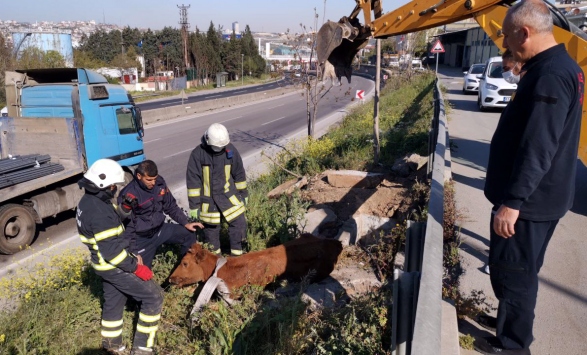Kocaeli'nde alınan bilgiye göre, Kayapınar Mahallesi Güven Sokak'ta 1,5 metre derinliğindeki çukura bir ineğin düştüğünü fark eden vatandaşlar, itfaiyeyi aradı.
