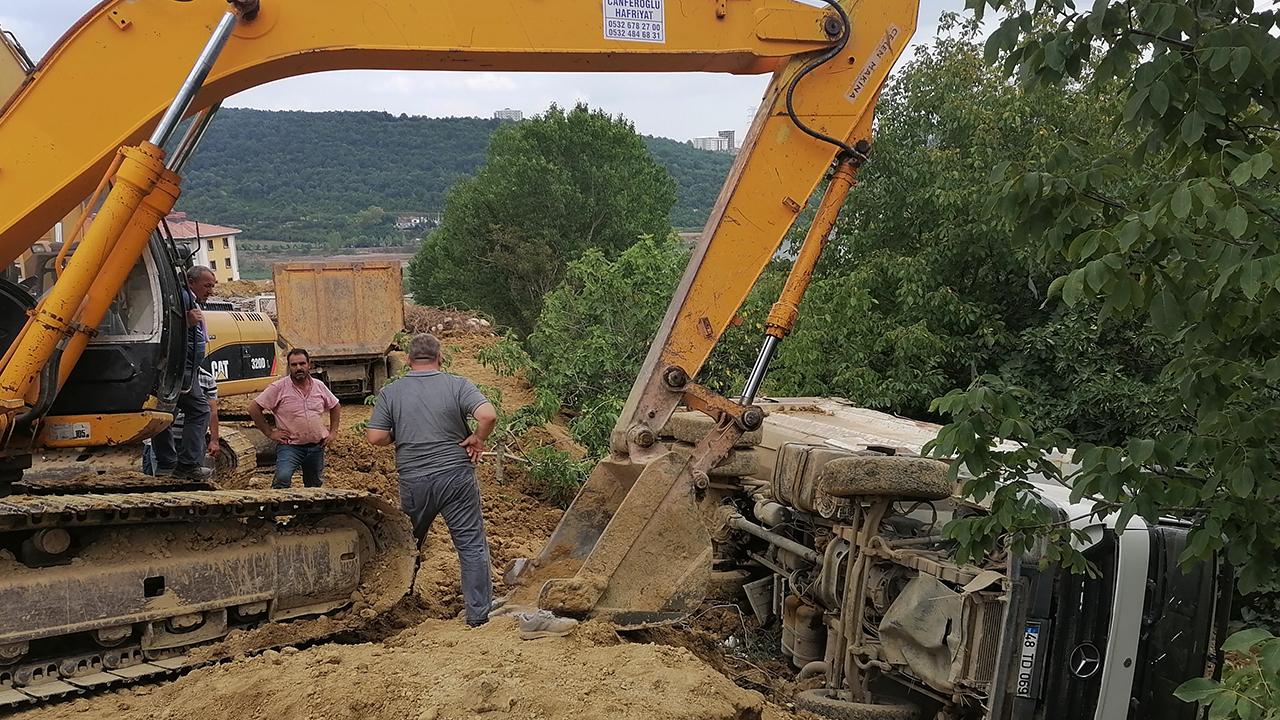 Şantiyedeki diğer işçilerin, kazıcı iş makineleriyle müdahalesi sonucu sürücü sıkıştığı yerden kurtarıldı.