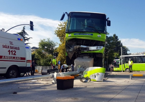 Çarpışmanın etkisiyle savrulan midibüs, yol kenarındaki trafik ışığını devirerek üzerinde kaldı.
