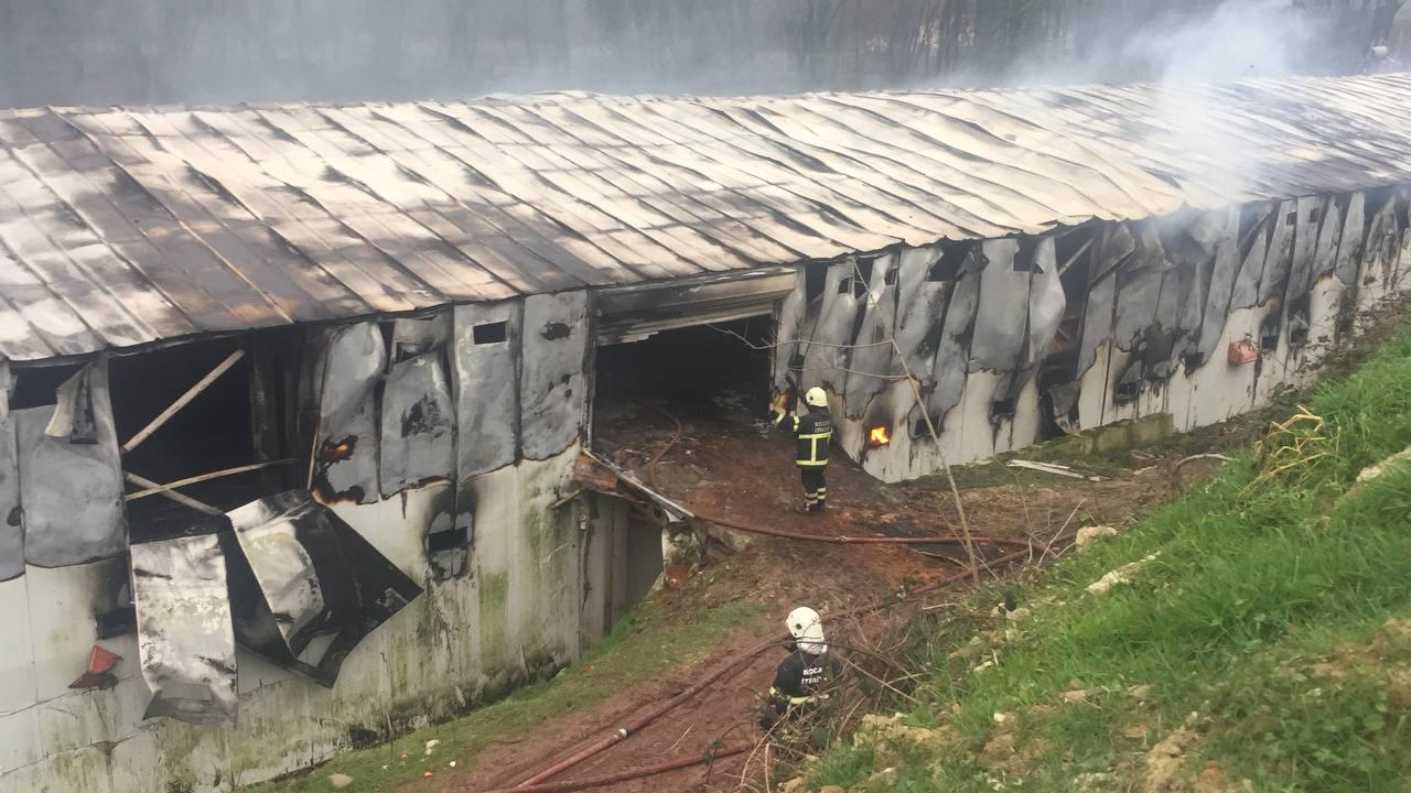 Yangını söndürme çalışmaları devam ederken, iş yeri çalışanları da çiftlikteki civcivleri kurtarmaya çalışıyor.