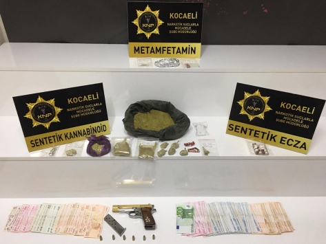 Şüpheli F.K'nin gözaltına alındığı operasyonda, adreste yapılan aramada 934,80 gram sentetik kannabinoid, 25,95 gram metamfetamin, 5 marka sentetik uyuşturucu hap, 1 ruhsatsız tabanca ve uyuşturucu satışından elde edildiği değerlendirilen 11 bin 60 lira ve 100 avro ele geçirildi.