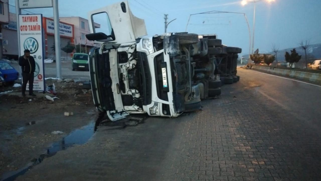 Adana istikametinden Malatya istikametine giden Zeynal Ö. idaresindeki tır, Yeni Sanayi Sitesi Kavşağı üzerinde sürücünün direksiyon hakimiyetini kaybetmesi sonucu kontrolden çıkarak yan yattı.