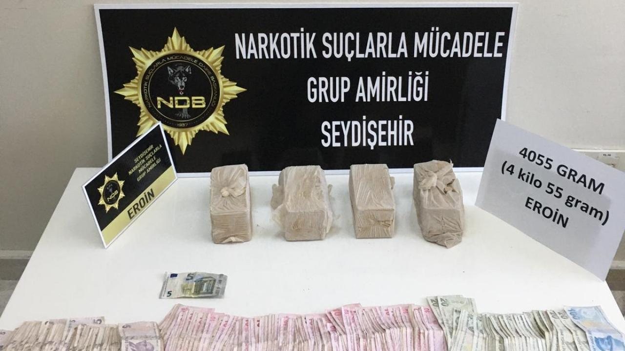 Araçta yapılan aramada 4 kilo 55 gram eroin ele geçirildi.
