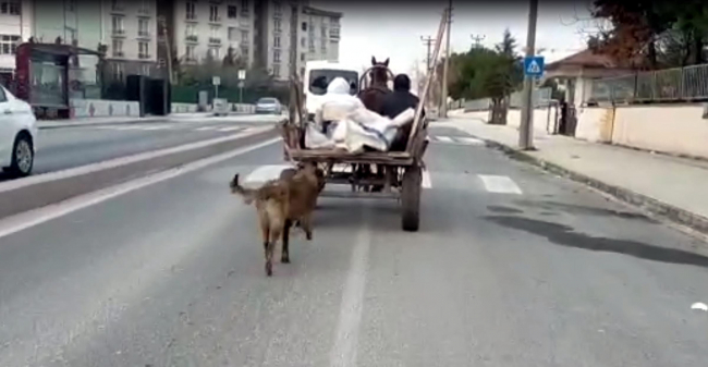 Caddede köpeğin at arabasının arkasına bağlandığı ve koştuğu anlar çevredekilerin cep telefonuyla görüntülendi.