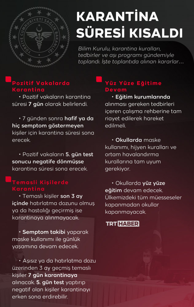 "Karantina sürelerinin mevcut koşullar dikkate alındığında yeniden düzenlenmesinin uygun olacağına karar verilmiştir. Pozitif vakaların karantina süresi 7 gün olarak belirlenmiştir. 7 günden sonra hafif ya da hiç semptom göstermeyen kişiler için karantina süresi sona erer. Pozitif vakalar 5. gün test yaptırmaları durumunda ve test sonucu negatife dönmüşse karantina süresi sona erer.