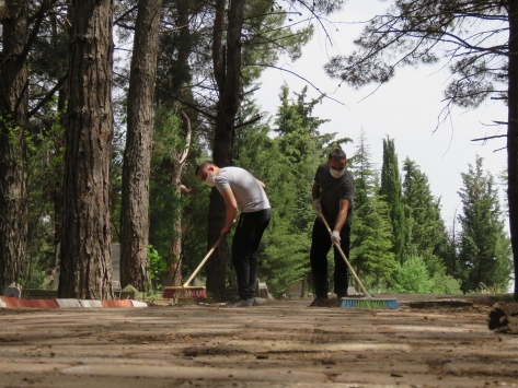 Gençlere destek veren köylüler traktör, tırmık, kürek gibi aletlerini de yanlarına alarak köy mezarlığında yeni tip koronavirüs (Kovid-19) mücadelesi kapsamında maske takarak ve sosyal mesafe kuralına uyarak bir araya geldi.