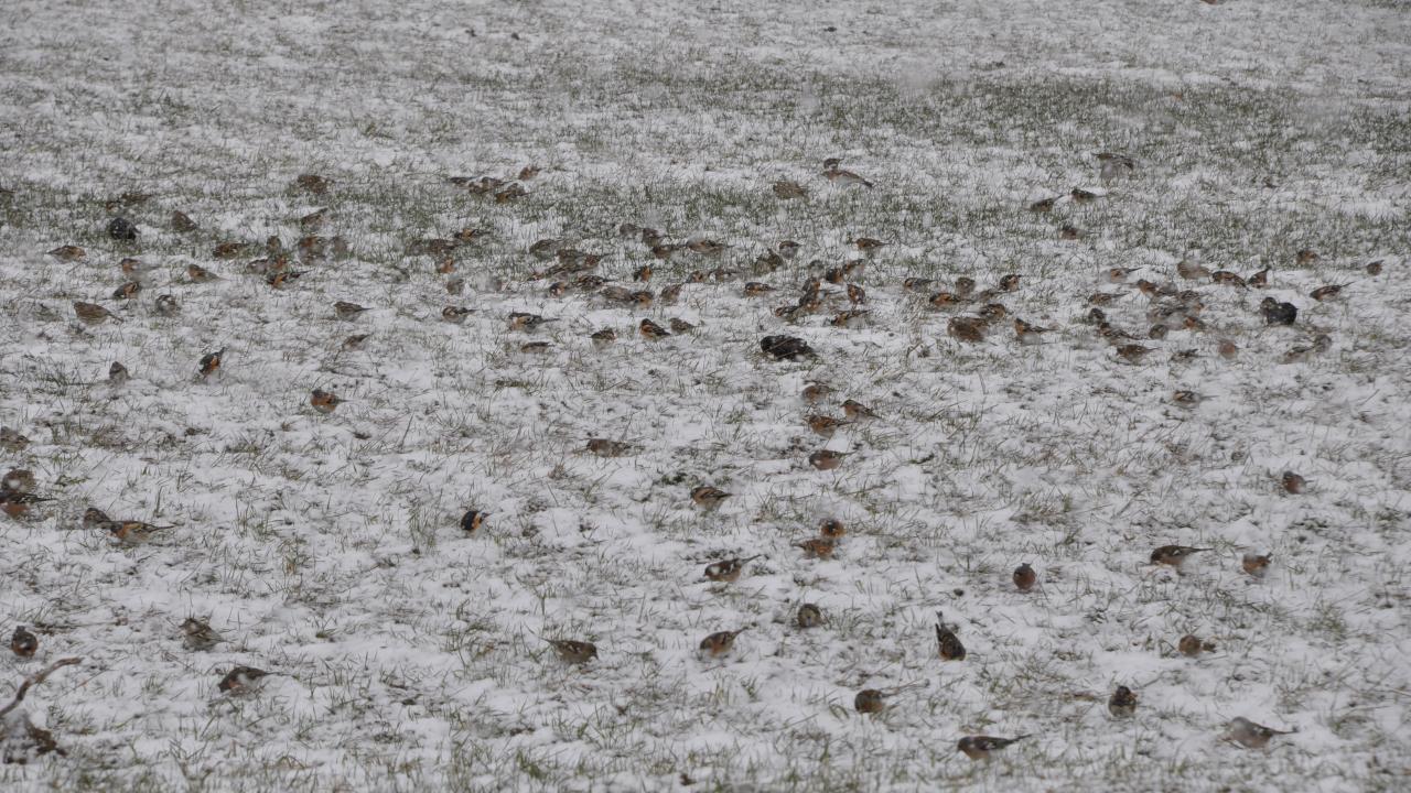 Serçe türü kuşların içlerinde değişik renkte kuşlarda birlikte hareket ederek kar yağışına rağmen yola koyulmak için adeta tarlaları bir baştan bir başa yürüyerek taradılar.