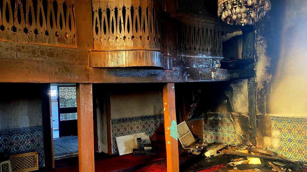 İtfaiye ekiplerinin müdahalesiyle söndürülen yangında camide hasar oluştu.